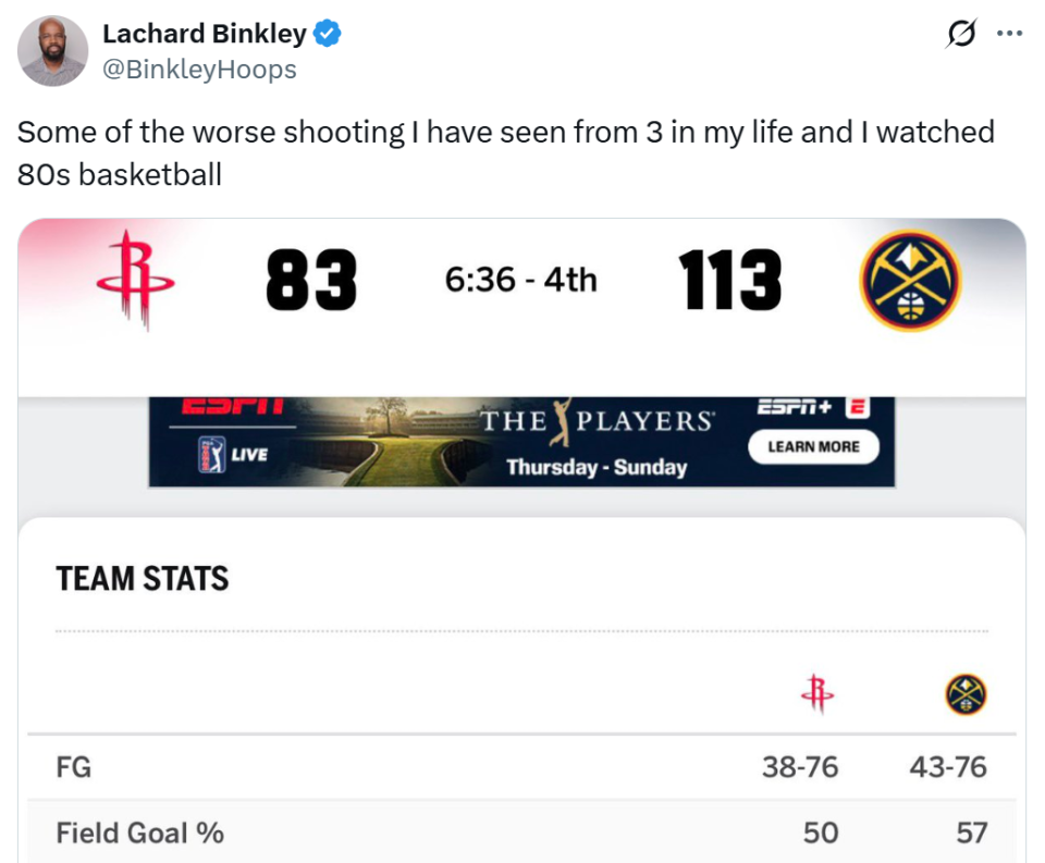 正如赛后火箭随队记者Lachard Binkley所说:“这是我见过最烂的三分投射表现之一,要知道,我可是看过80年代篮球的人。”