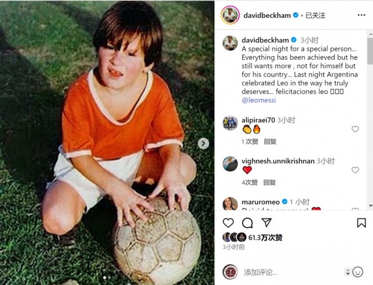 英格兰足坛名宿、迈阿密国际老板贝克汉姆更新社媒动态,晒出梅西儿时的照片,并写道:“一个特别的人度过了一个特别的夜晚……他已经取得了一切成就,但他仍然渴望更多,不是为了自己,而是为了他的国家……昨晚阿根廷以他真正应得的方式致敬了莱奥……祝贺莱奥。”