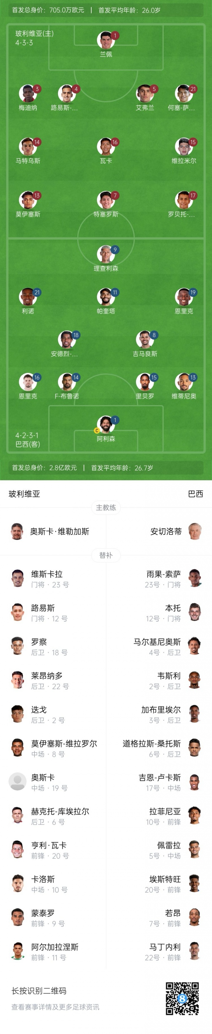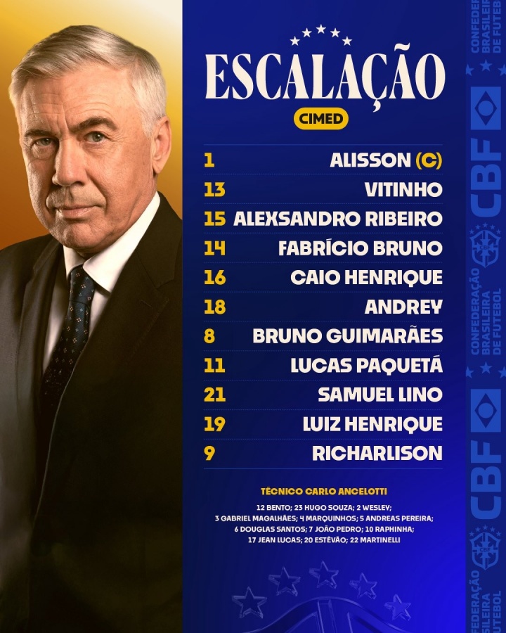 巴西替补:12-本托、23-雨果-索萨、2-韦斯利、3-加布里埃尔、4-马尔基尼奥斯、5-佩雷拉、6-道格拉斯-桑托斯、7-若昂-佩德罗、10-拉菲尼亚、17-吉恩-卢卡斯、20-埃斯特旺、22-马丁内利