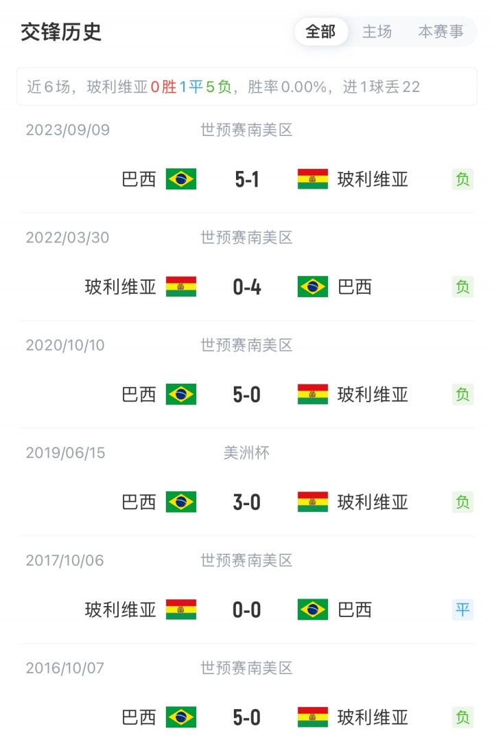 世预赛巴西近3轮不败,玻利维亚上轮0-3客场不敌哥伦比亚。巴西正式比赛中对阵玻利维亚已6场不败(5胜1平)。