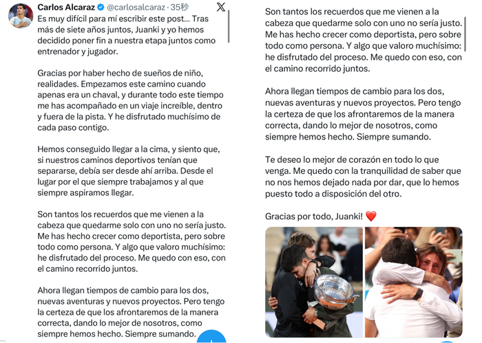 在他的分手信中,阿尔卡拉斯写道:“我们从我还是个孩子时就开始了这段旅程,在这段时间里,你陪伴我走过了一段不可思议的旅程,无论是在场上还是场下,我非常享受与你共度的每一步。”