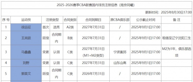8月30日讯 今天,CBA官网更新了国内球员注册信息,其中,同曦男篮新增注册5名球员。